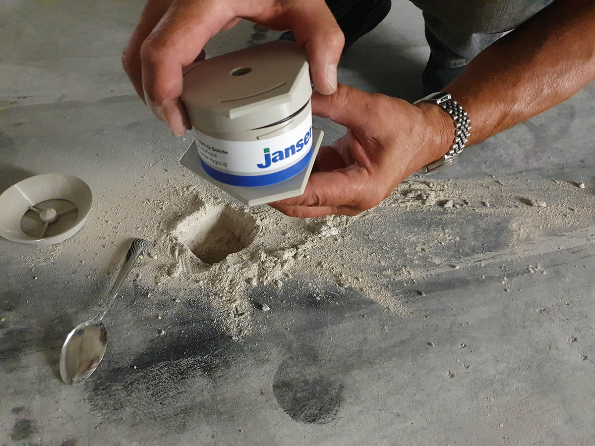 Dieses Feuchtepotenzial des Probenmaterials bestimmen wir mit der KRL-Messmethode, durch Messung der entsprechenden korrespondierenden relativen Luftfeuchtigkeit an einer aus dem Estrich entnommenen Stemmprobe.